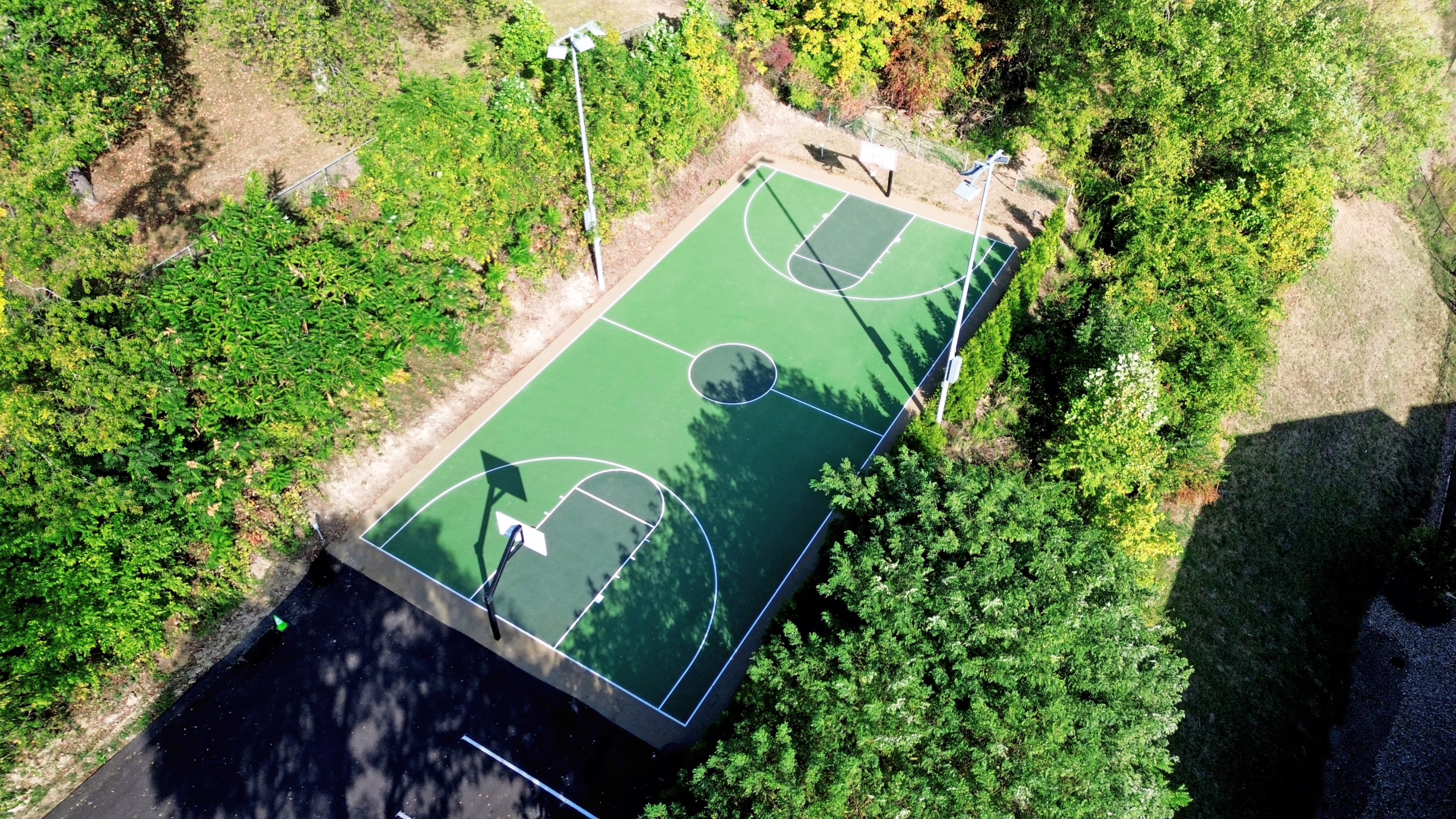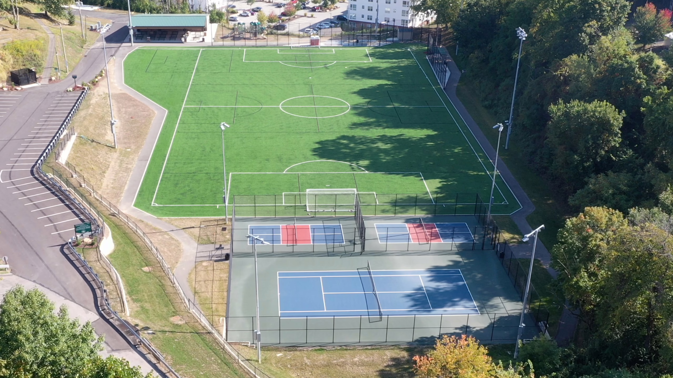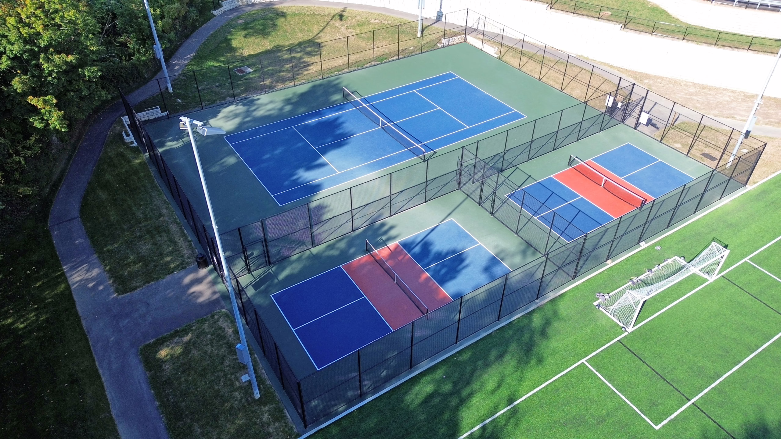 Keystone then installed paving for the tennis, pickleball, and basketball courts. After installing new asphalt, Keystone Sports Construction installed the new acrylic surface coating on the fresh pavement. Afterward, tennis, pickleball, and basketball line striping were provided for the courts. Additionally, Musco sports lighting was installed for the turf field, tennis courts, and pickleball courts, along with chain-link fencing surrounding both the tennis and pickleball courts. Paved walkways were then installed connecting the courts and fields.