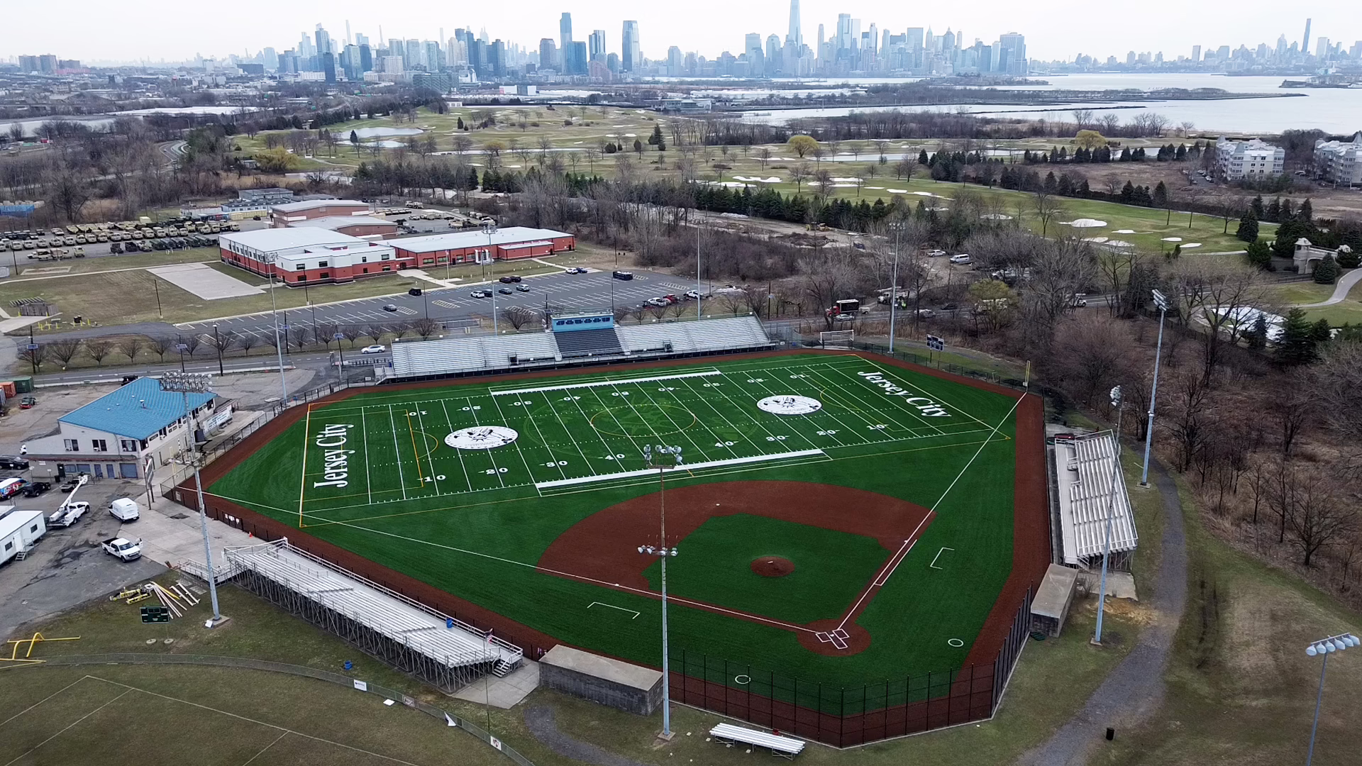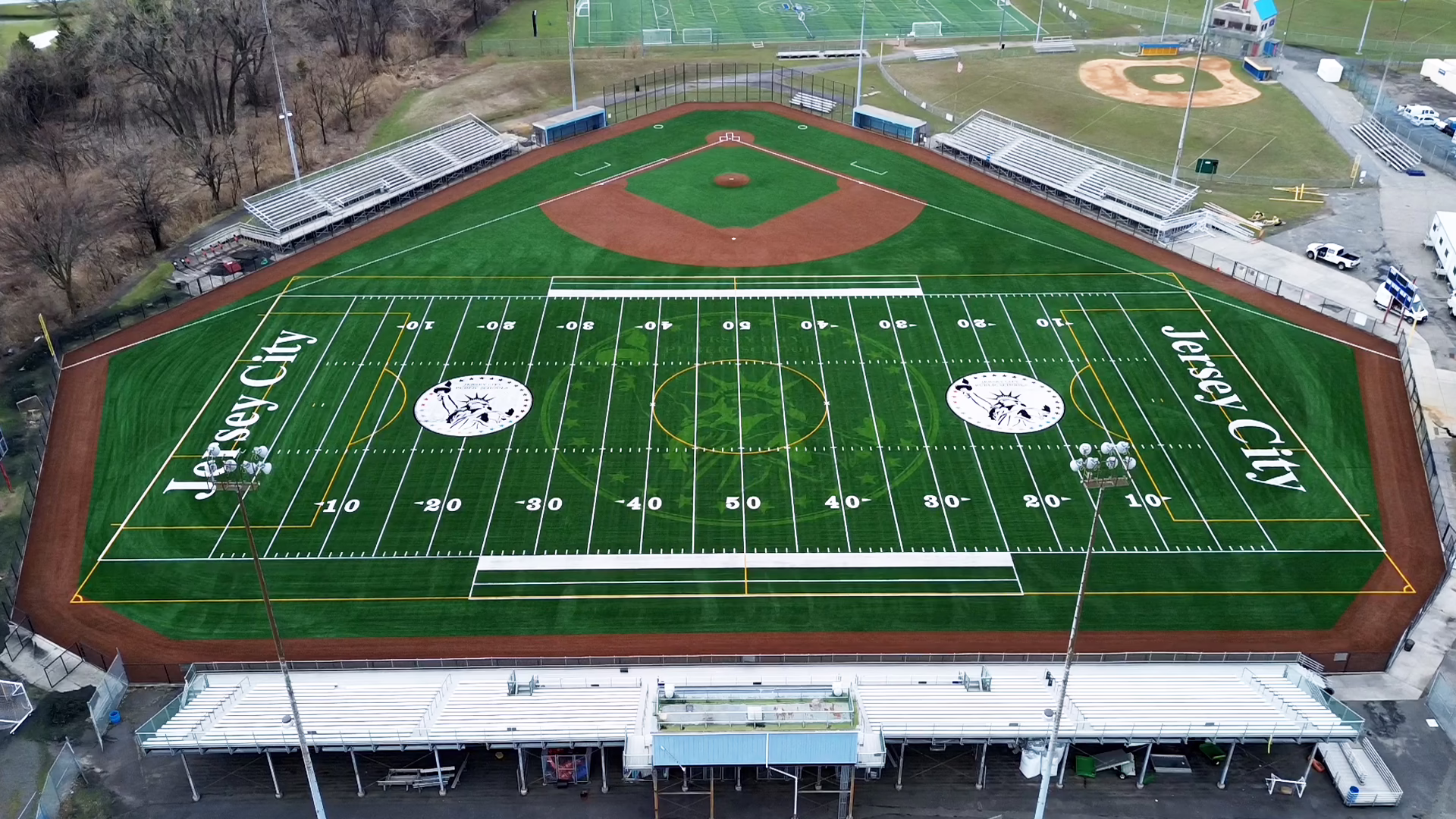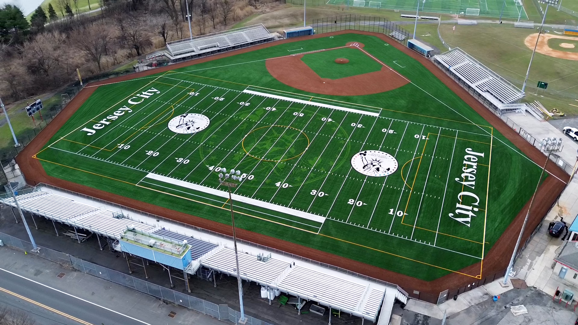 Keystone Sports Construction recently completed renovations to the multisport turf field at the Caven Point Athletic Complex in Jersey City, New Jersey. The complex is a central spot for local high schools and the Jersey City Board of Education for athletics. The project was initiated with the removal and disposal of existing turf, along with reclaiming and recycling the existing infill. This project utilized Shaw Sports Turf Game On technology to design and install Legion Pro synthetic turf for the football and soccer fields. Additionally, Legion synthetic turf was installed for the belly of the football and soccer field, Legion Pro for the outfield and green infield, TruHop for the infield, and Momentum for the warning track. Design elements from the project include a midfield logo, two logos at the 20-yard lines, endzones with “Jersey City” lettering, and sports lines for baseball, football, and soccer. Additionally, new goal posts were supplied and installed.