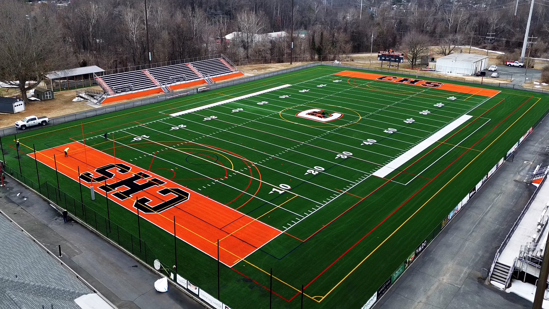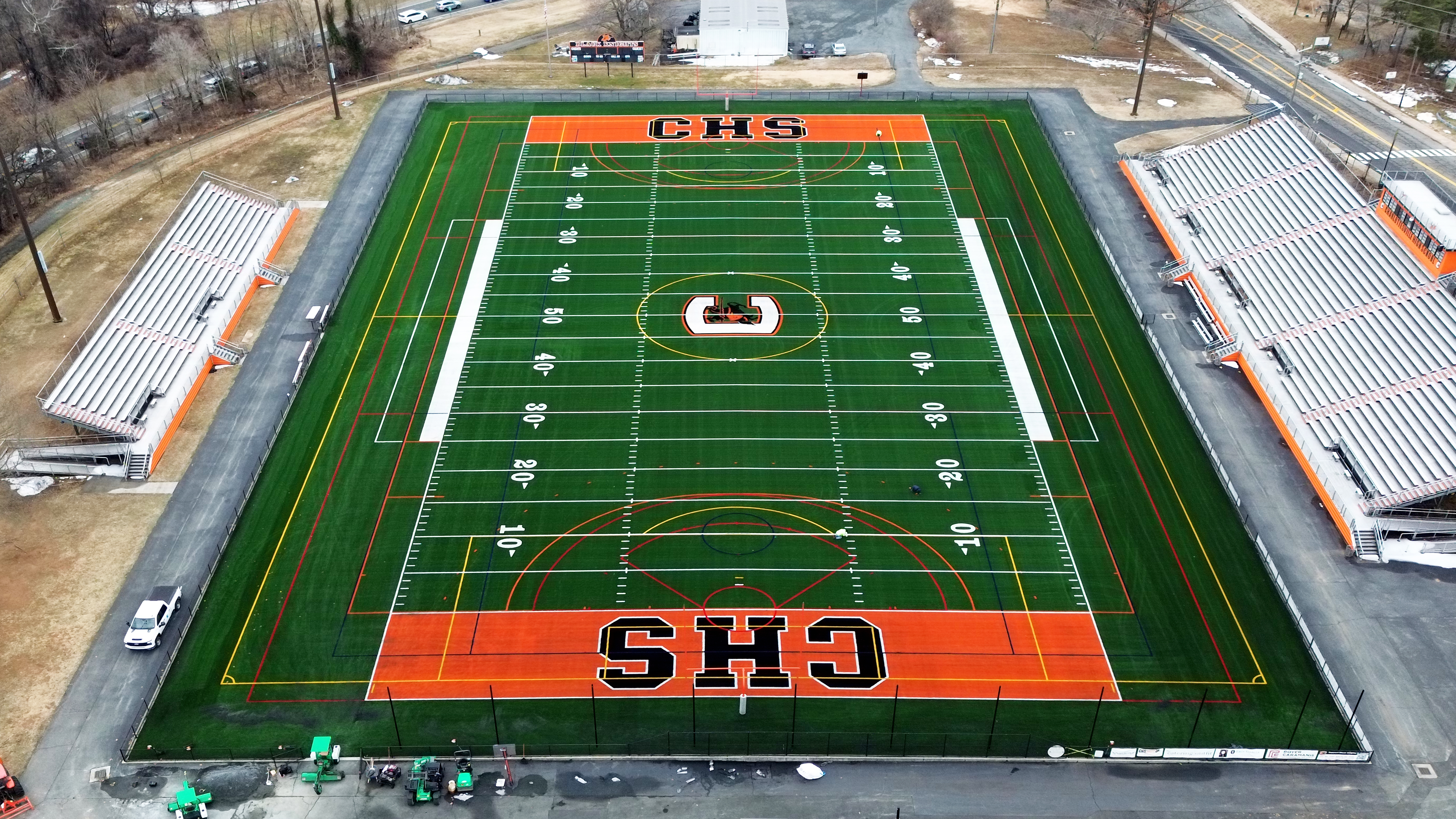 Keystone Sports Construction recently completed renovations to the turf field at Charlottesville High School in Charlottesville, Virginia. Founded in 1904, Charlottesville is the second-largest school in its district. The project was initiated with the removal and disposal of existing turf, along with reclaiming and recycling the existing infill. Afterwards, the existing stone base was laser graded. This project utilized Shaw Sports Turf Game On technology to design and install Legion Pro dual-fiber synthetic turf. Design elements from the project include a midfield logo, colored endzones with “CHS” lettering, and sports lines for football, soccer, field hockey, and men’s and women’s lacrosse.