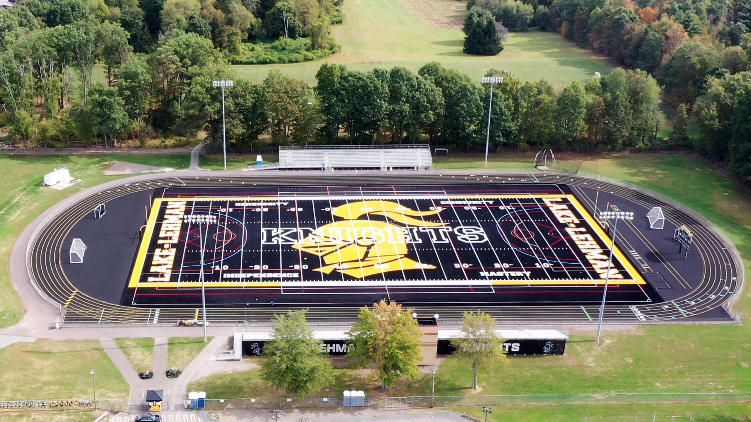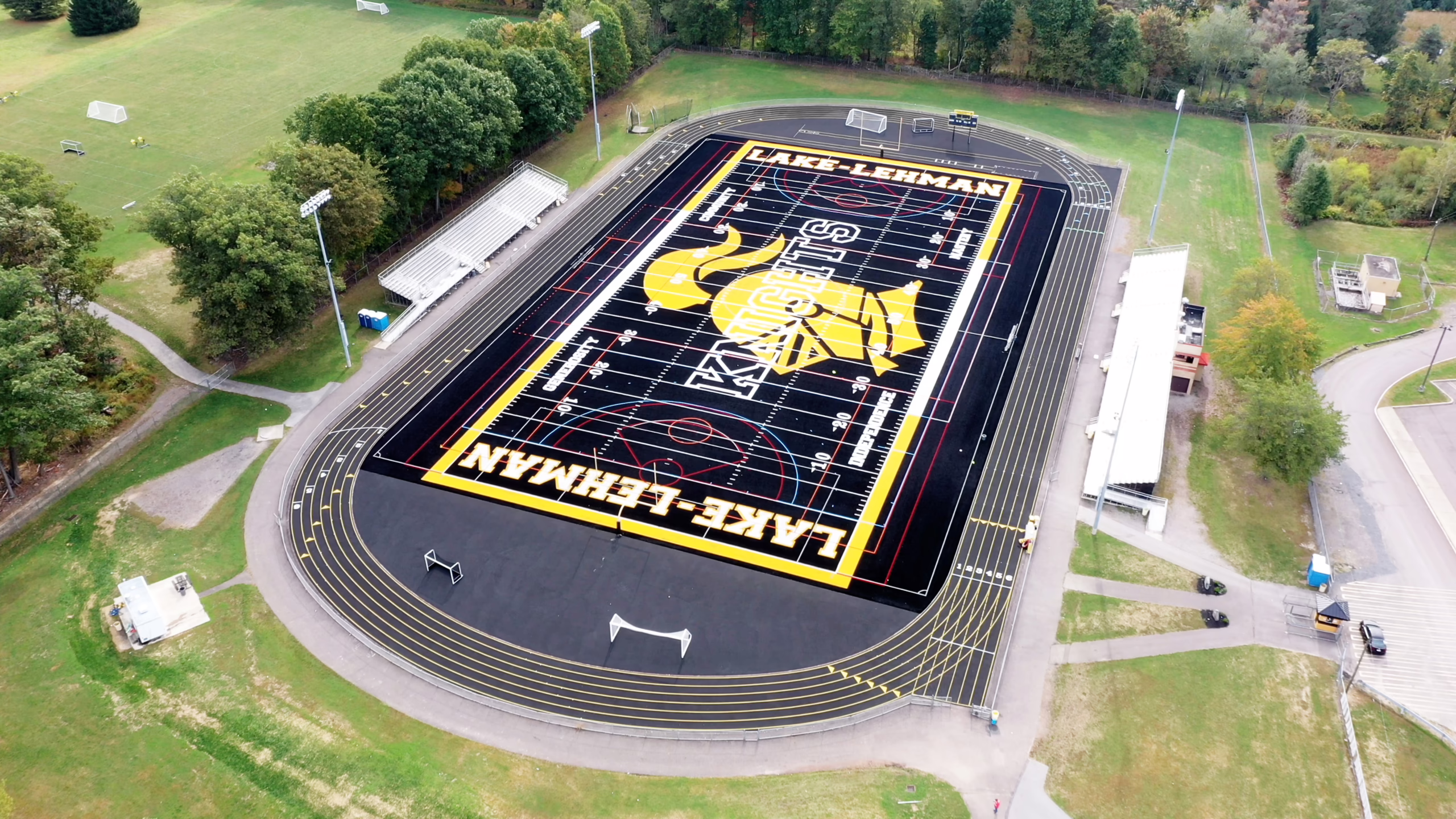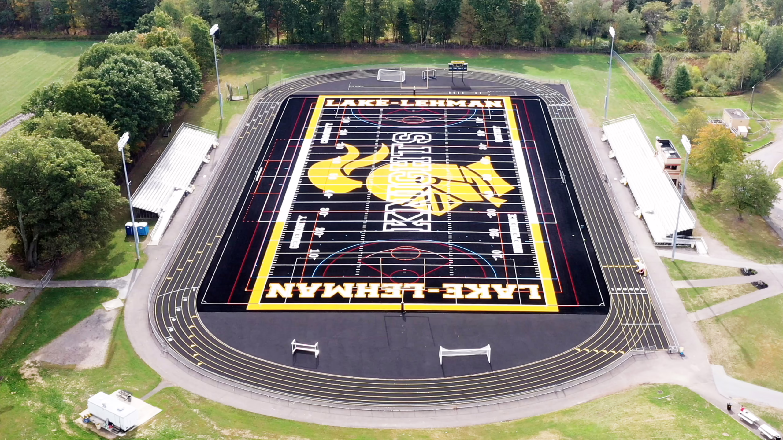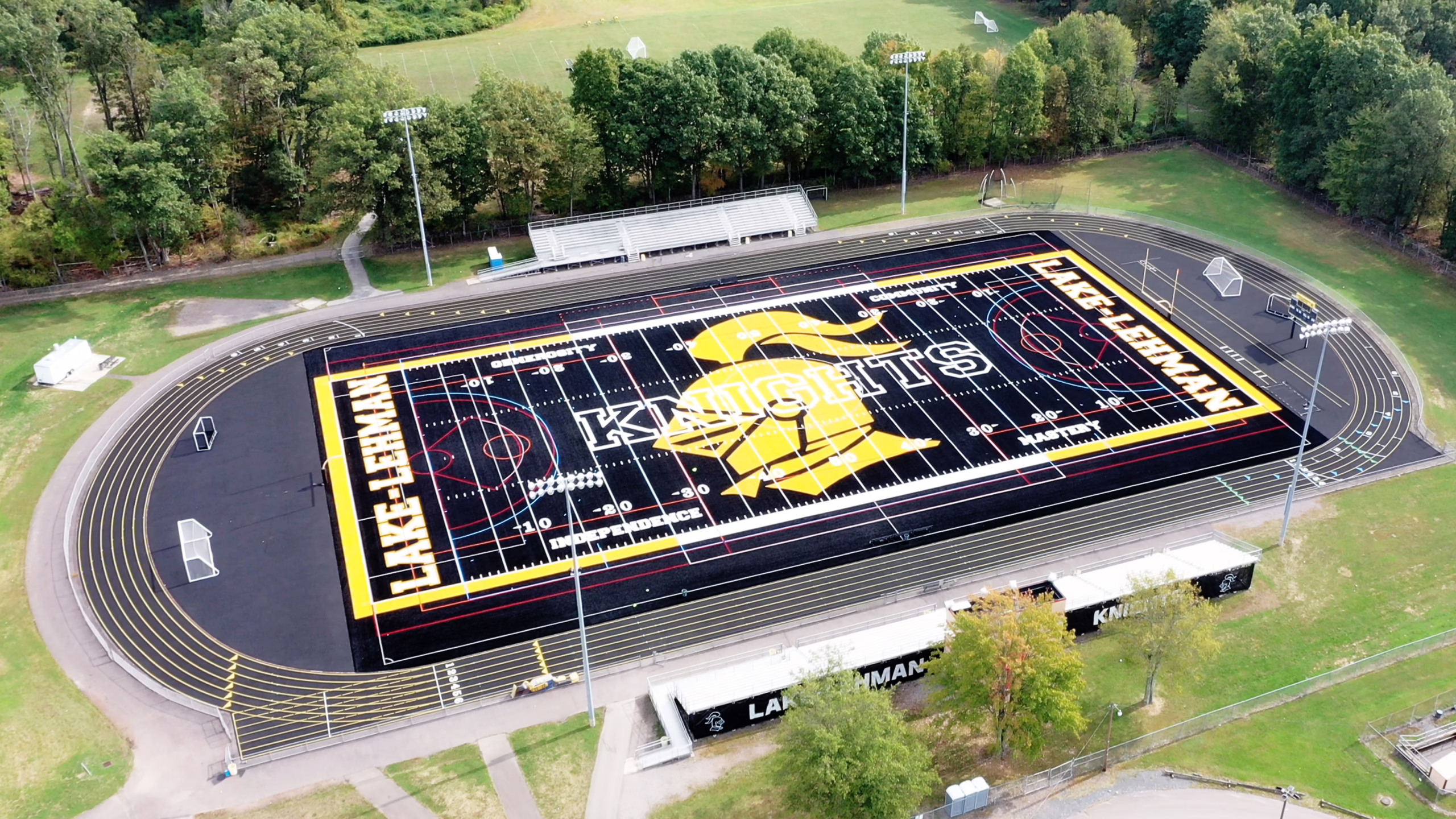 Keystone Sports Construction recently completed renovations to the turf field and running track at Lake Lehman High School for the Lake Lehman School District in Lehman, Pennsylvania. Lake-Lehman calls its high school athletes the “Knights” and offers varsity and junior varsity teams in football, girls’ and boys’ soccer, volleyball, and cross country. The project was initiated with the removal and disposal of existing turf and track, along with reclaiming and recycling the existing infill. Afterward, a two-component sandwich-style synthetic running track surfacing was installed in the running track. This project utilized Shaw Sports Turf Game On technology to design and install Legion Pro dual-fiber synthetic turf. Design elements from the project included a tufted midfield logo with “KNIGHTS” lettering, black panel yard lines, black colored endzones with “LAKE-LEHMAN” lettering, sideline “GENEROSITY,” “COMMUNITY,” “INDEPENDENCE,” and “MASTERY” lettering, tufted sports lines for and sports lines for football, and inlaid sports lines for soccer, field hockey, men’s lacrosse, and women’s lacrosse.