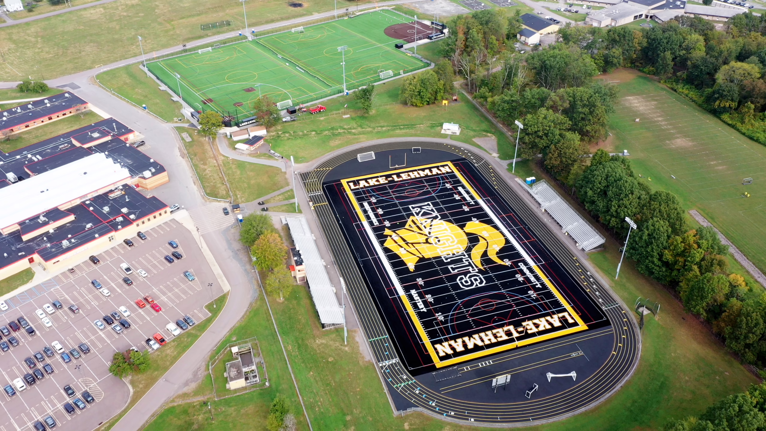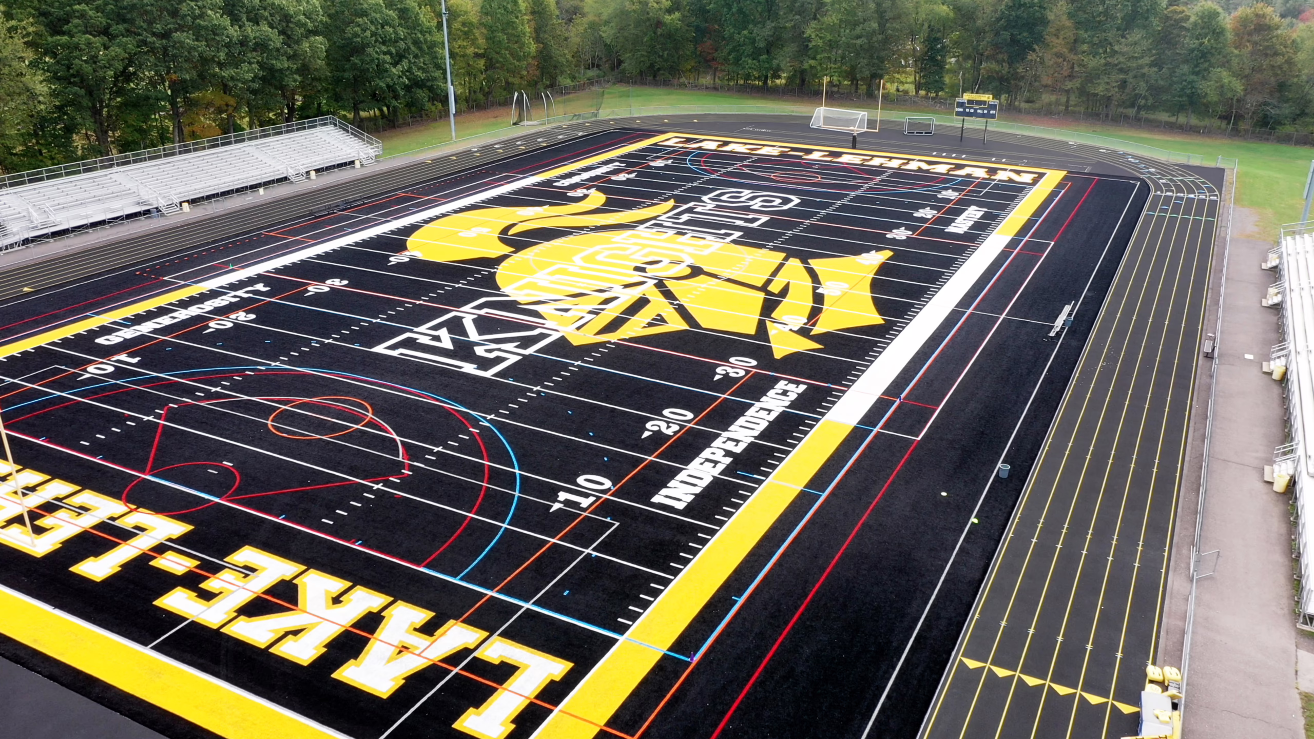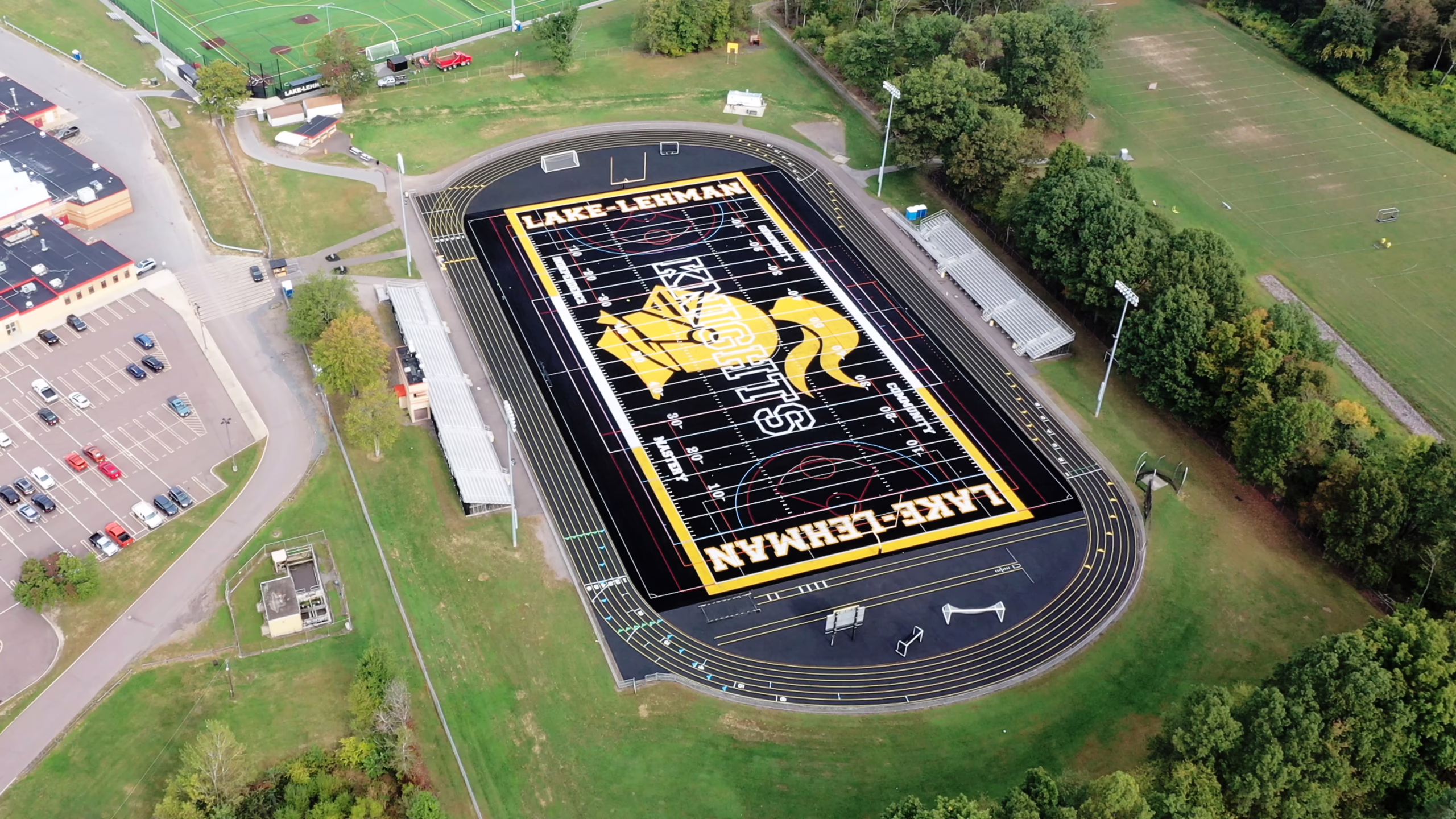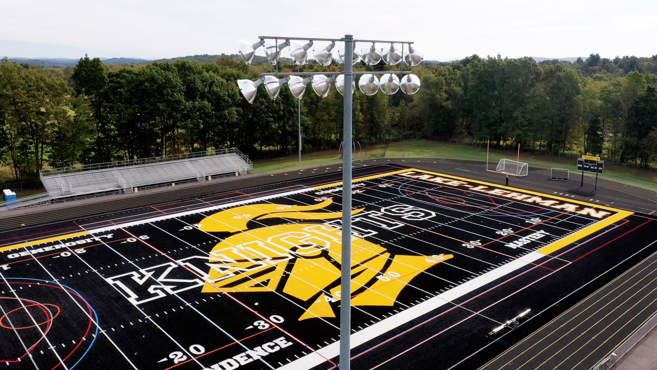 Keystone Sports Construction recently completed renovations to the turf field and running track at Lake Lehman High School for the Lake Lehman School District in Lehman, Pennsylvania. Lake-Lehman calls its high school athletes the “Knights” and offers varsity and junior varsity teams in football, girls’ and boys’ soccer, volleyball, and cross country. The project was initiated with the removal and disposal of existing turf and track, along with reclaiming and recycling the existing infill. Afterward, a two-component sandwich-style synthetic running track surfacing was installed in the running track. This project utilized Shaw Sports Turf Game On technology to design and install Legion Pro dual-fiber synthetic turf. Design elements from the project included a tufted midfield logo with “KNIGHTS” lettering, black panel yard lines, black colored endzones with “LAKE-LEHMAN” lettering, sideline “GENEROSITY,” “COMMUNITY,” “INDEPENDENCE,” and “MASTERY” lettering, tufted sports lines for and sports lines for football, and inlaid sports lines for soccer, field hockey, men’s lacrosse, and women’s lacrosse.