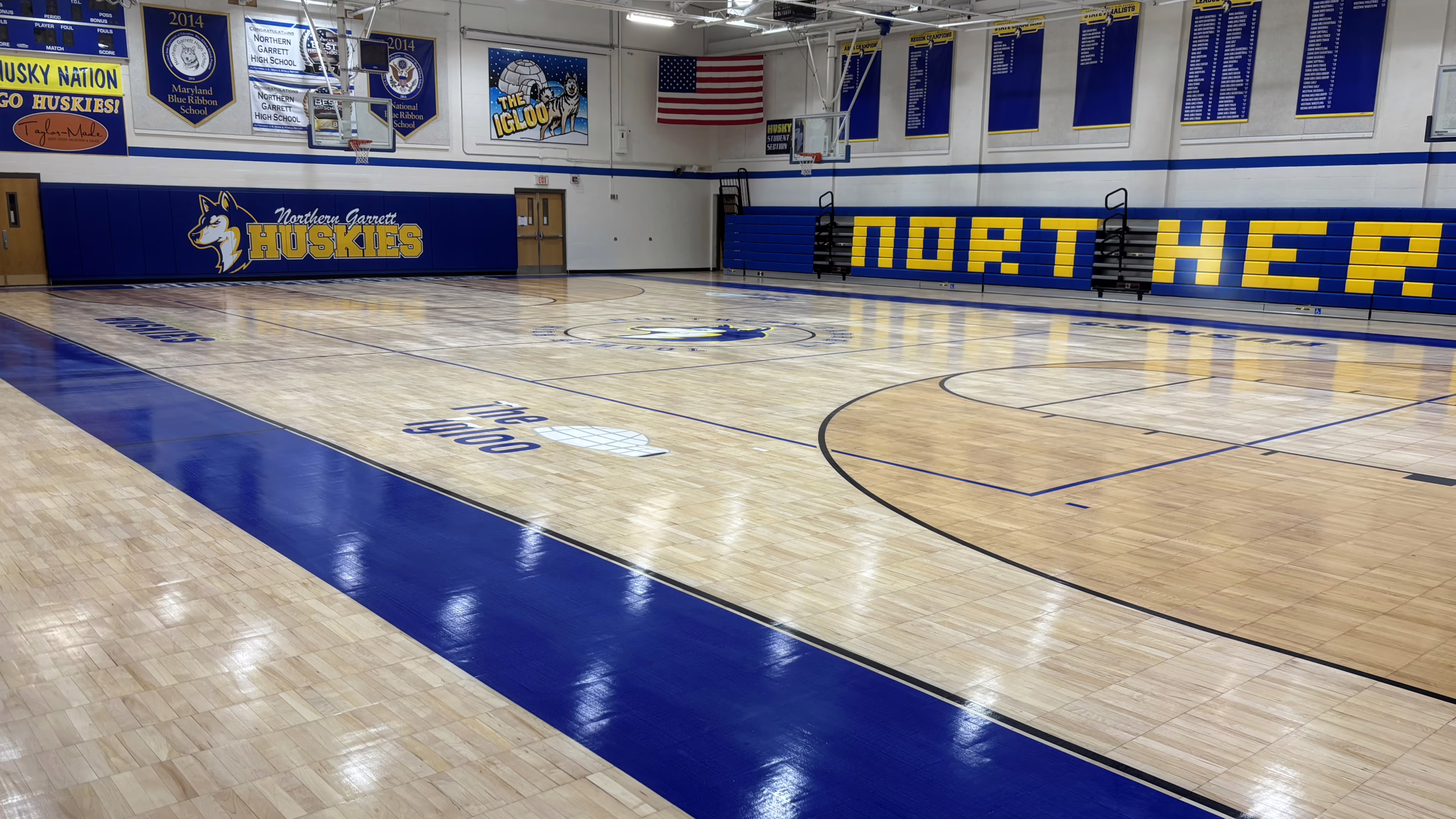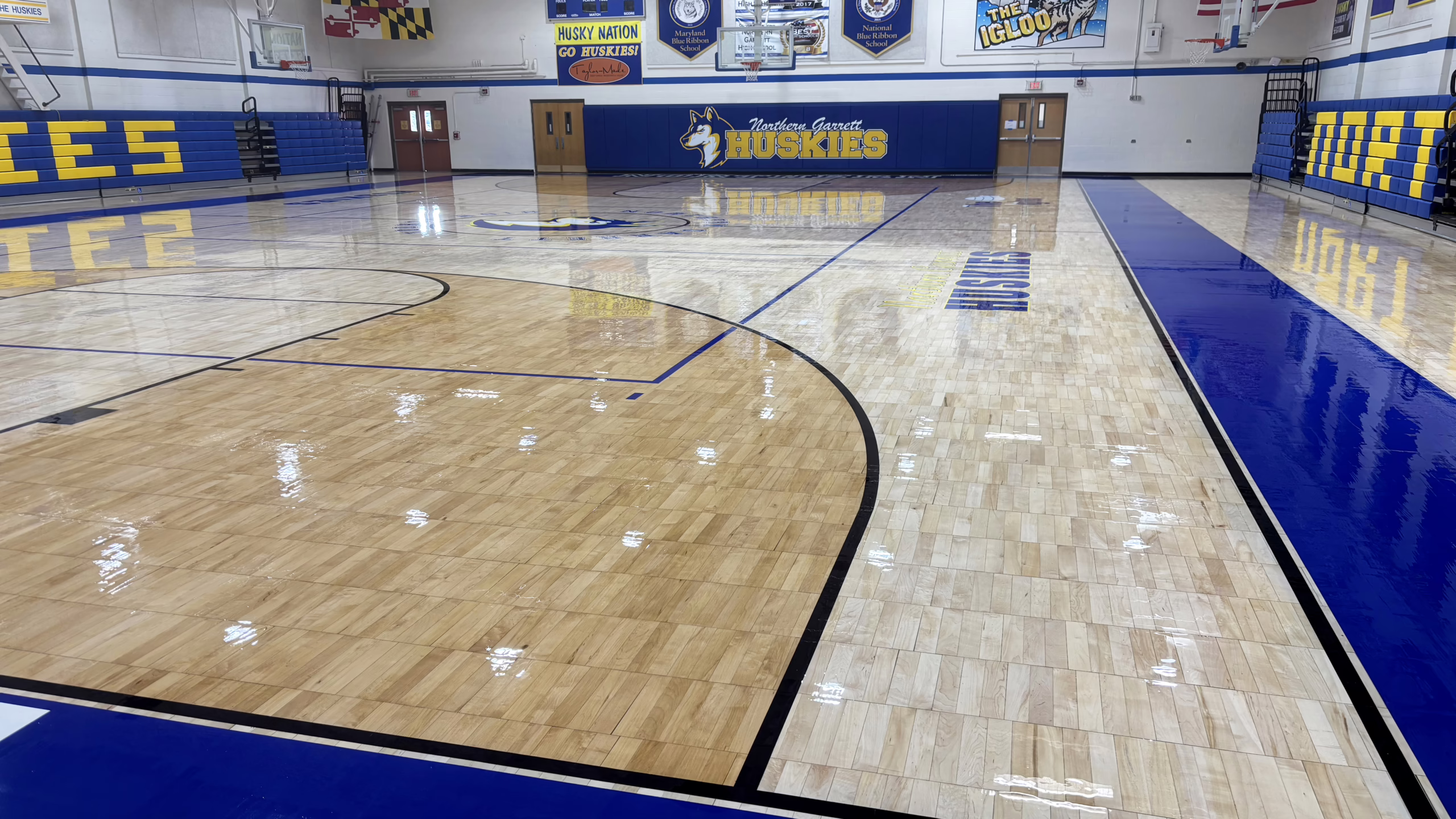 Keystone Sports Construction recently completed renovations to the main gymnasium hardwood floors for Northern Garrett High School, located in Accident, Maryland. Northern Garrett High School is a four-year public secondary education school that houses approximately 500 students from the northern end of Garrett County. The project started by taping off all existing volleyball plates. Next steps included screening the existing floor surface, followed by applying two coats of MFMA-certified polyurethane.