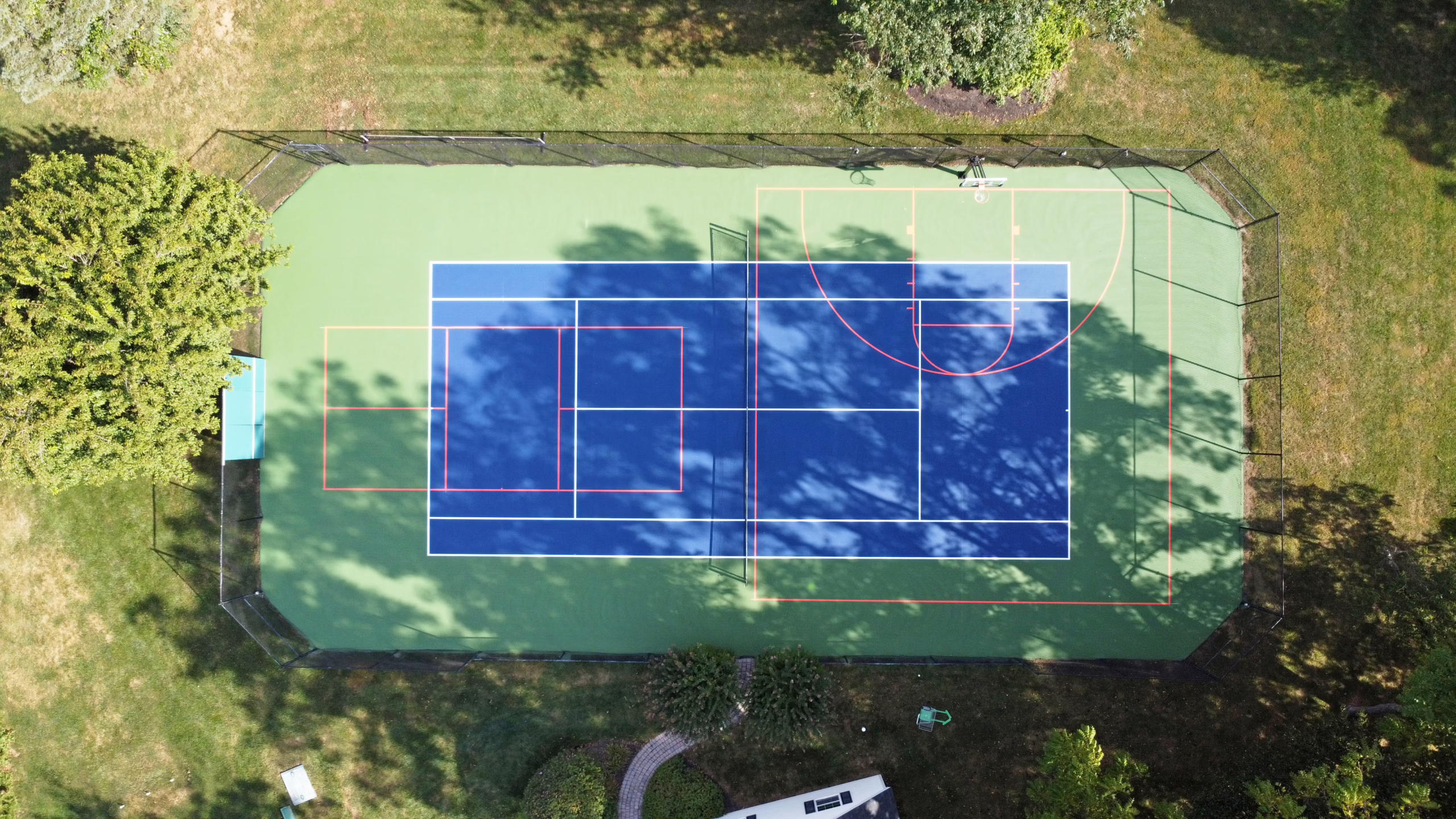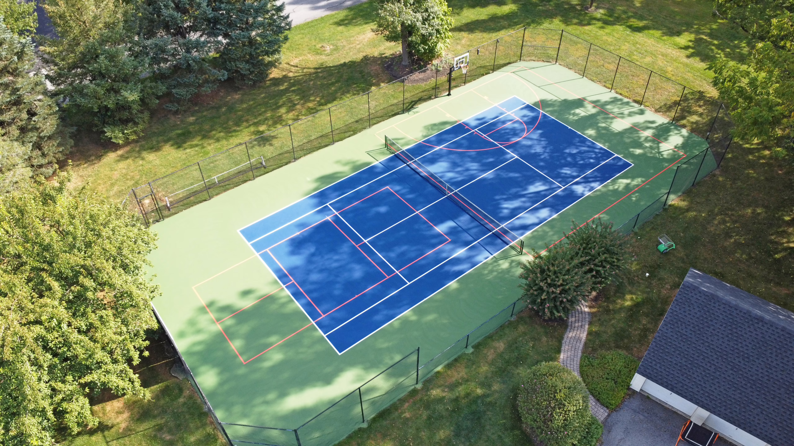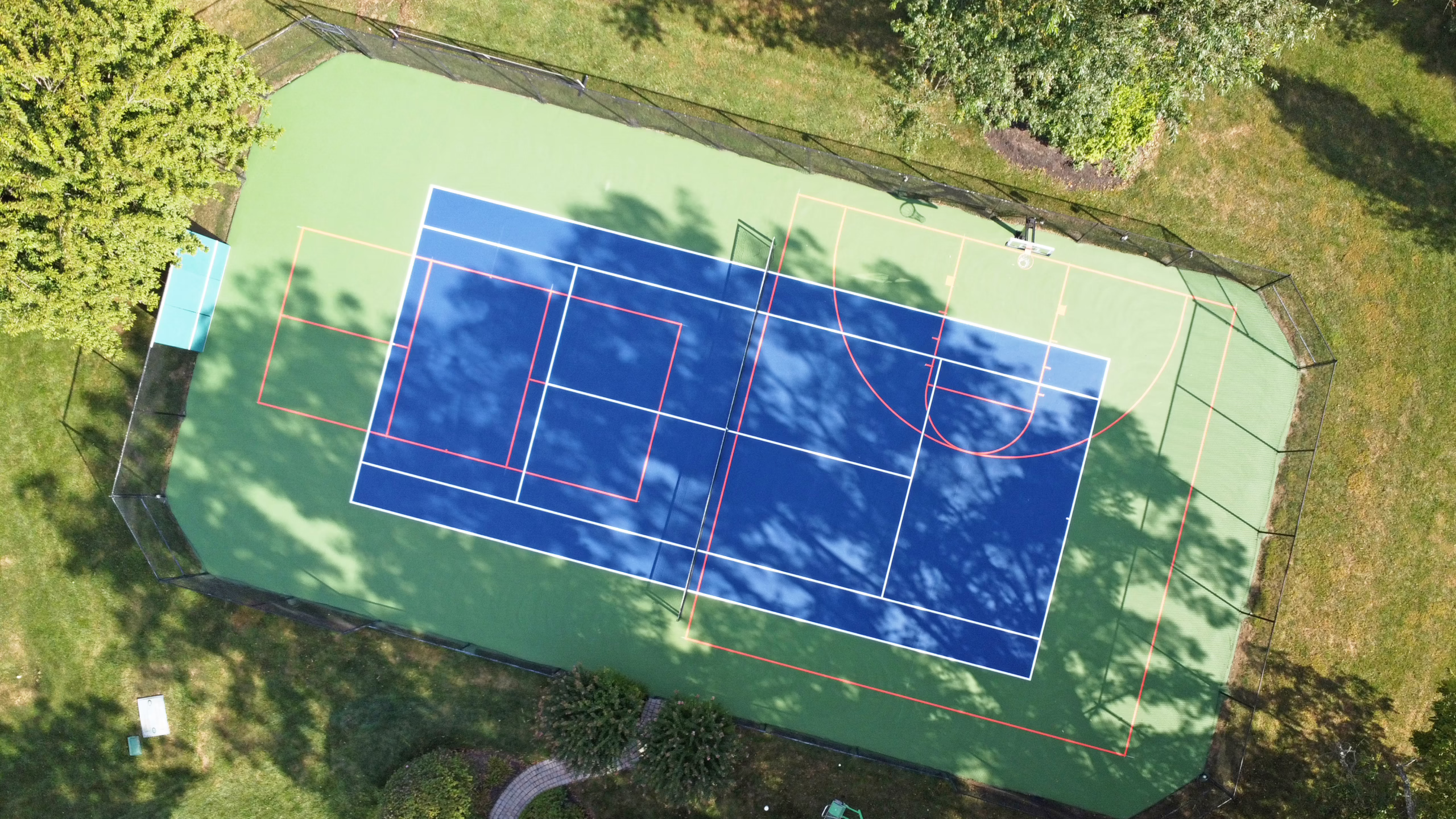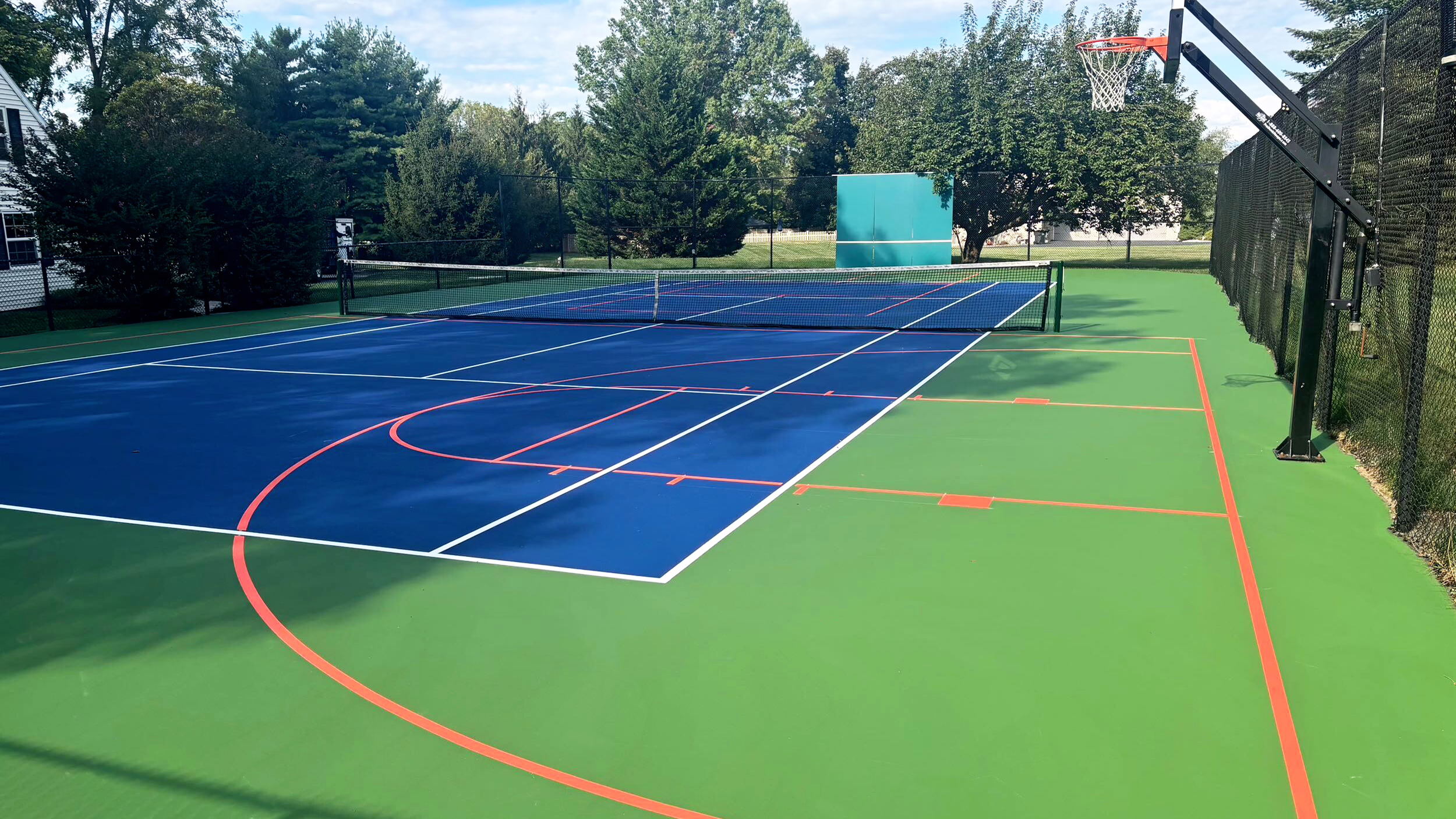 Keystone Sports Construction recently completed renovations to the tennis, pickleball, and basketball combined court for a personal residence in Reading, Pennsylvania. Located in the heart of Berks County, Reading is known for its rich history, vibrant community, and passion for recreation—making it the perfect setting for a private tennis court at home. The project included repairing minor surface cracking, resurfacing, and installing new acrylic surface coatings on the courts. Afterward, tennis, blended basketball, and blended pickleball line striping were provided for the court.