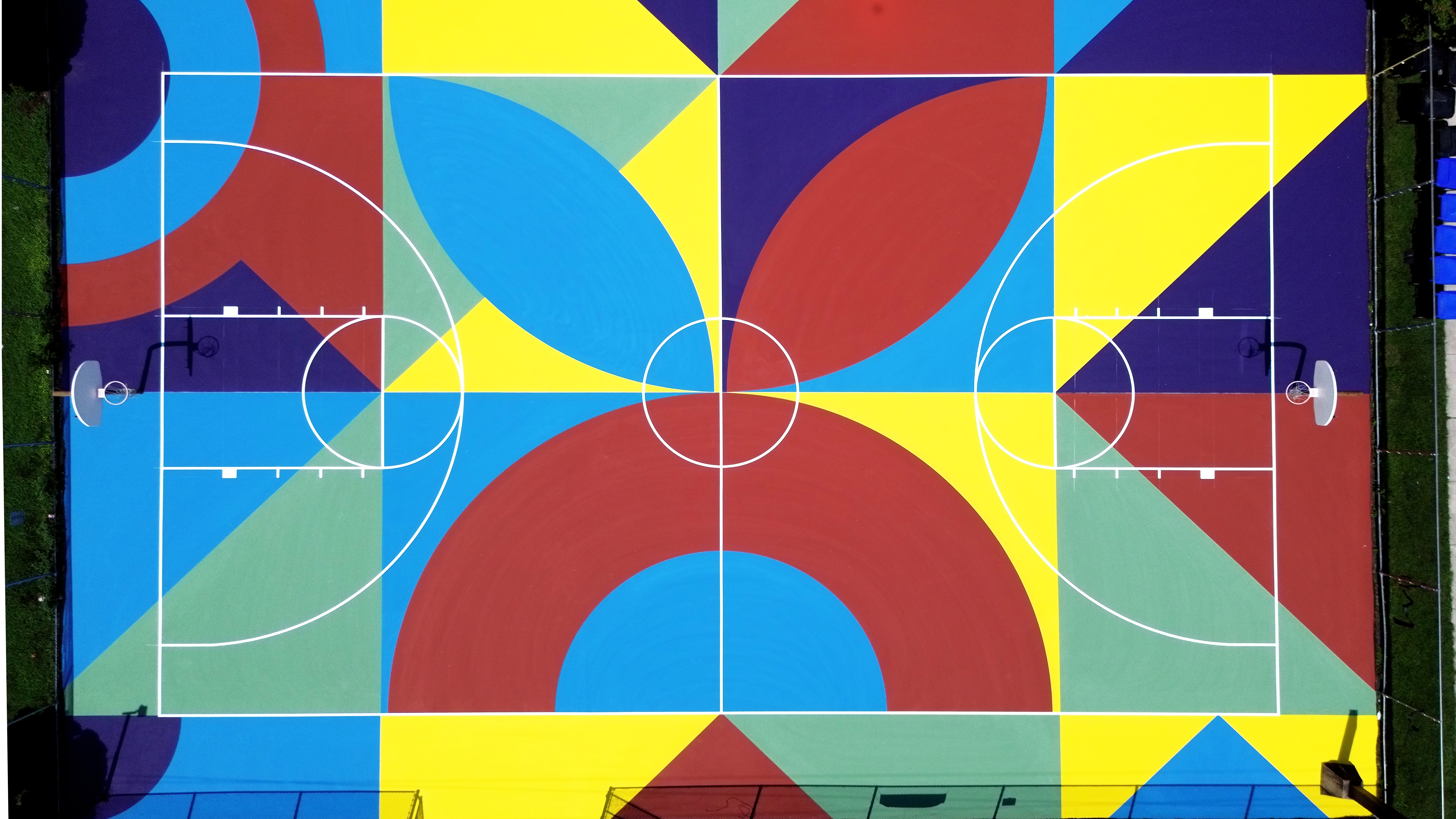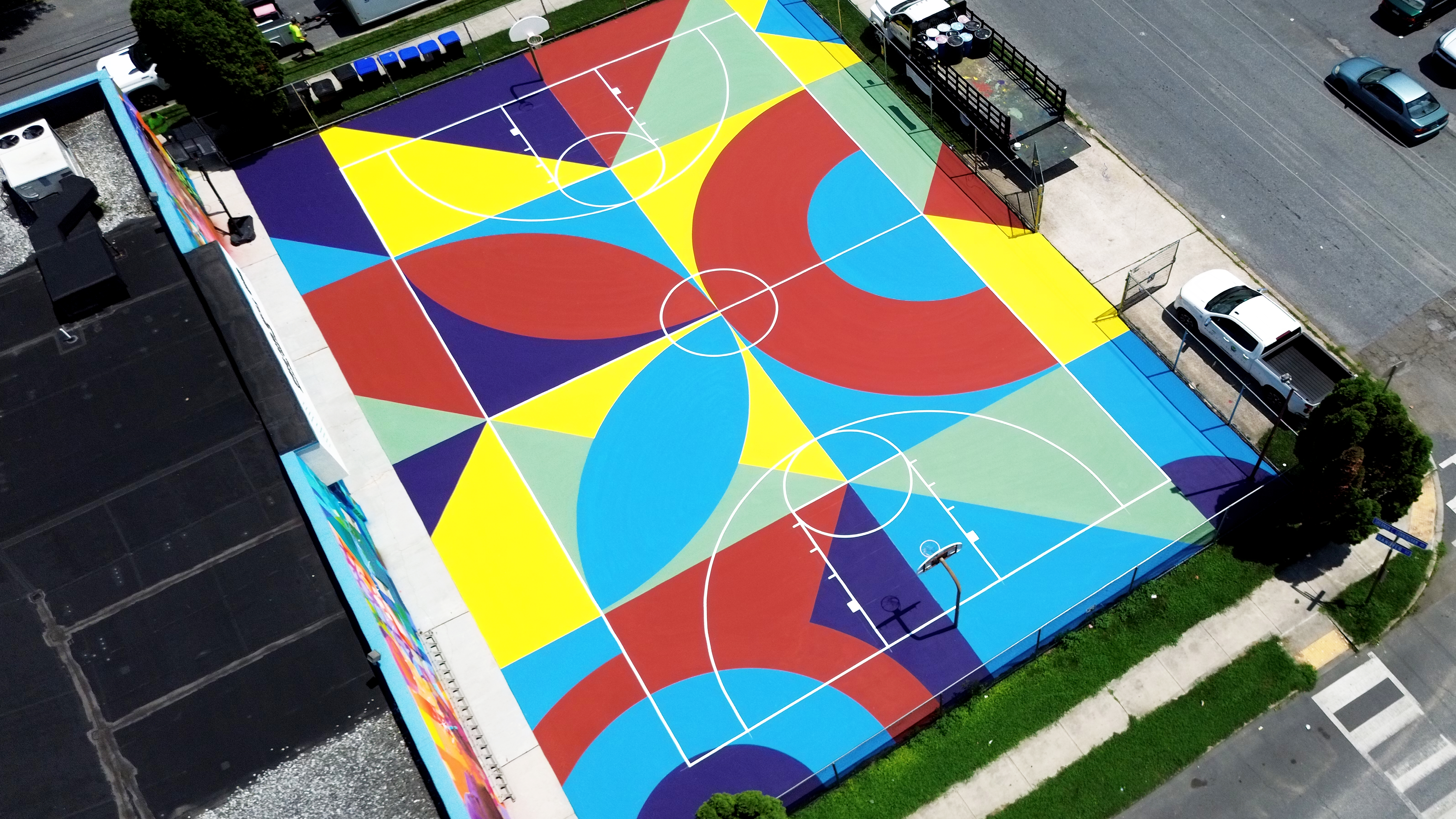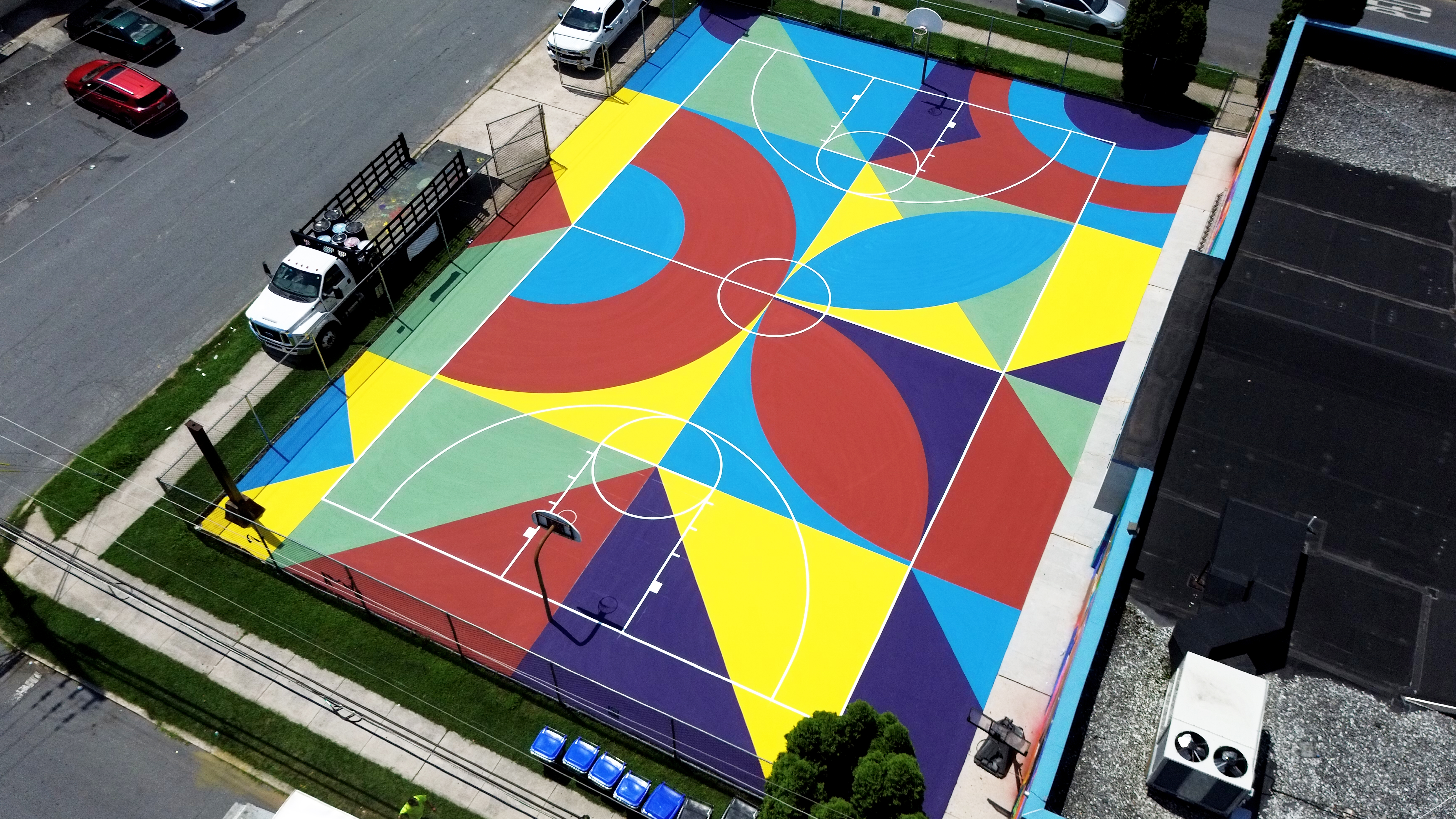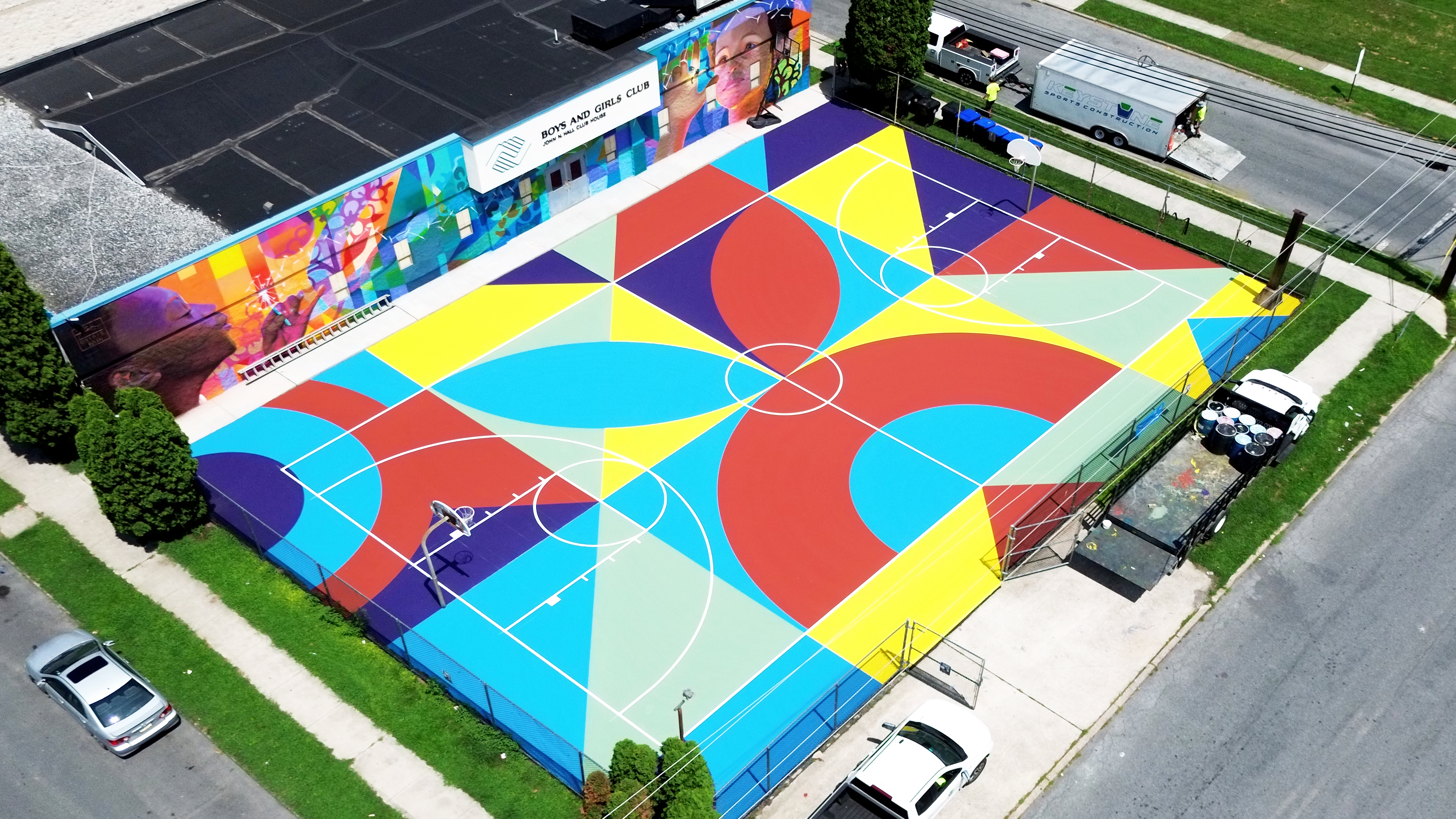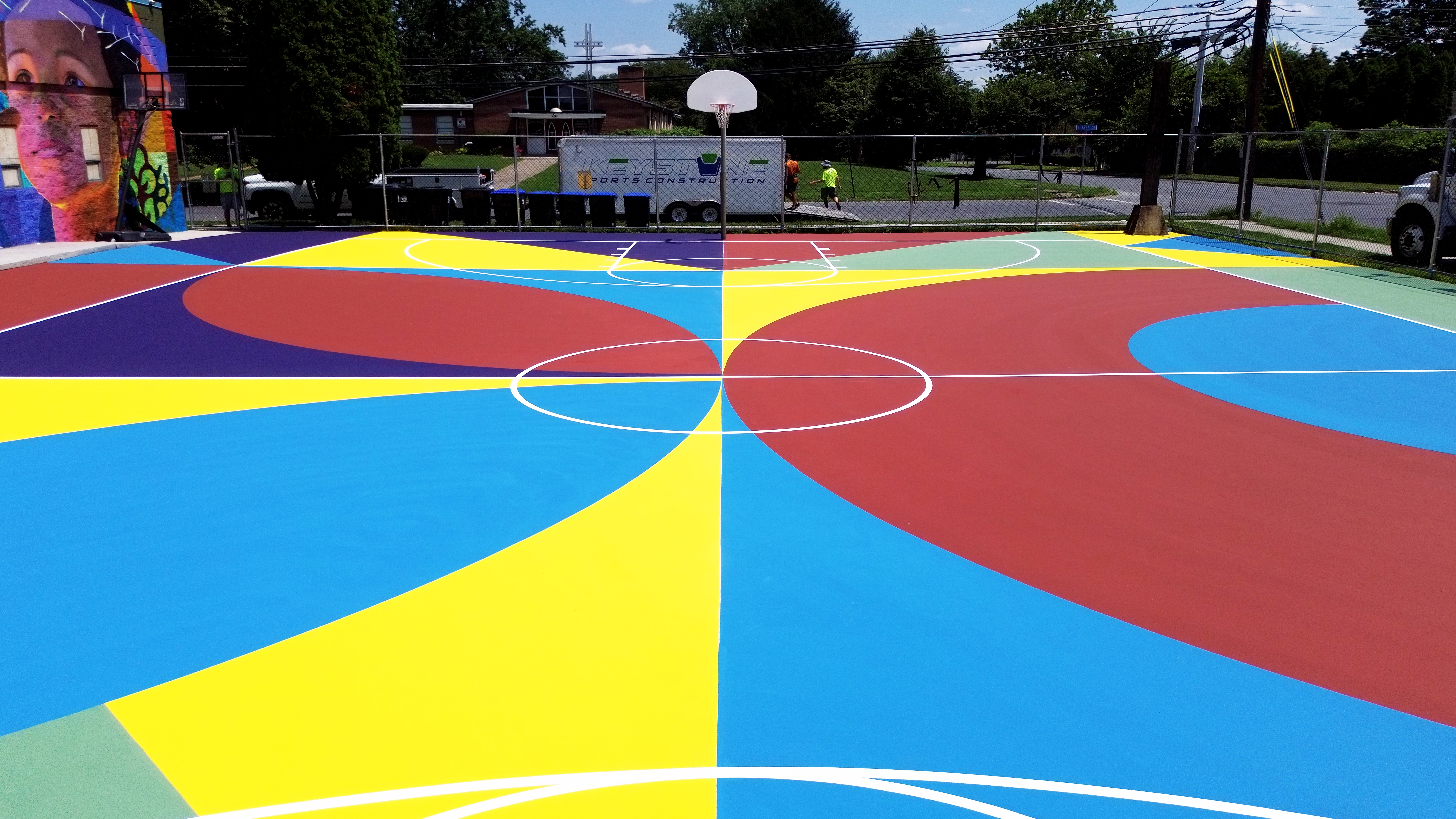 Keystone Sports Construction recently completed renovations to the basketball court at the Boys and Girls Club for Sprocket Mural Works in Harrisburg, Pennsylvania. Sprocket Mural Works collaborates with neighborhoods, artists, and organizations to create vibrant community murals in the Harrisburg region, which now includes this unique court. The project was initiated with a mill and pave of the existing court, after which Keystone Sports Construction installed the new acrylic surface coating on the freshly milled pavement. Afterward, basketball line striping was provided for the court. Design elements of this project include uniquely colored shapes and patterns throughout the court.