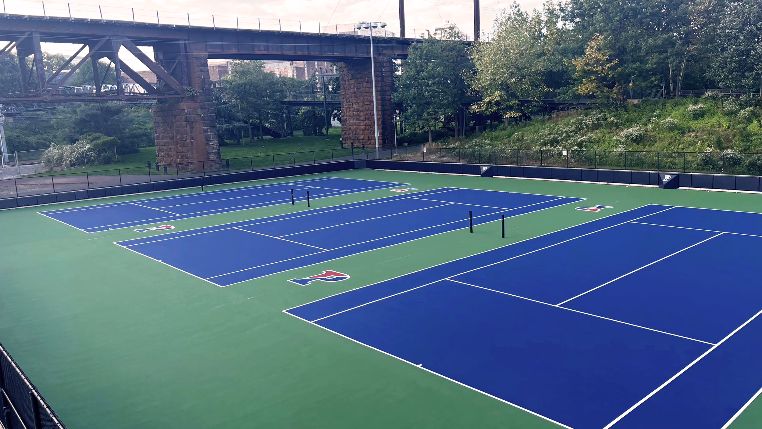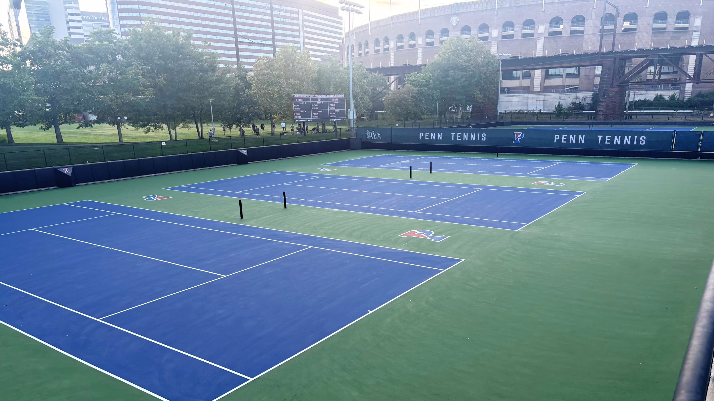 Keystone Sports Construction recently completed renovations of the tennis courts for the University of Pennsylvania, located in Philadelphia, Pennsylvania. UPenn is a private Ivy League research university founded in 1755 and one of the nine colonial colleges. The project included repairing minor surface cracking with epoxy and fiberglass crack repair material, resurfacing, and installing new acrylic surface coatings to the court. Design elements for this project include eight logos located between the courts. Afterward, tennis line striping was provided for the courts.