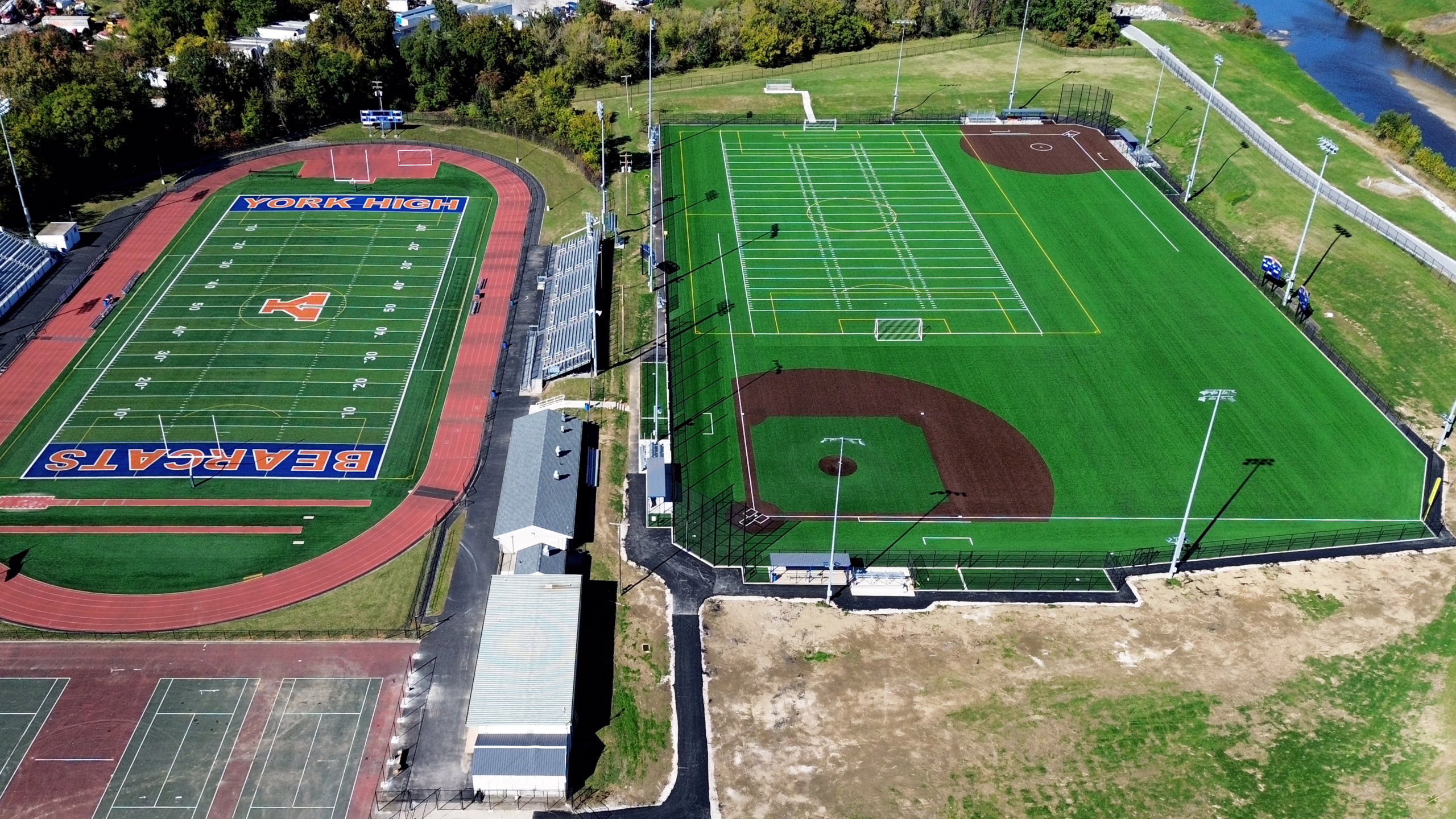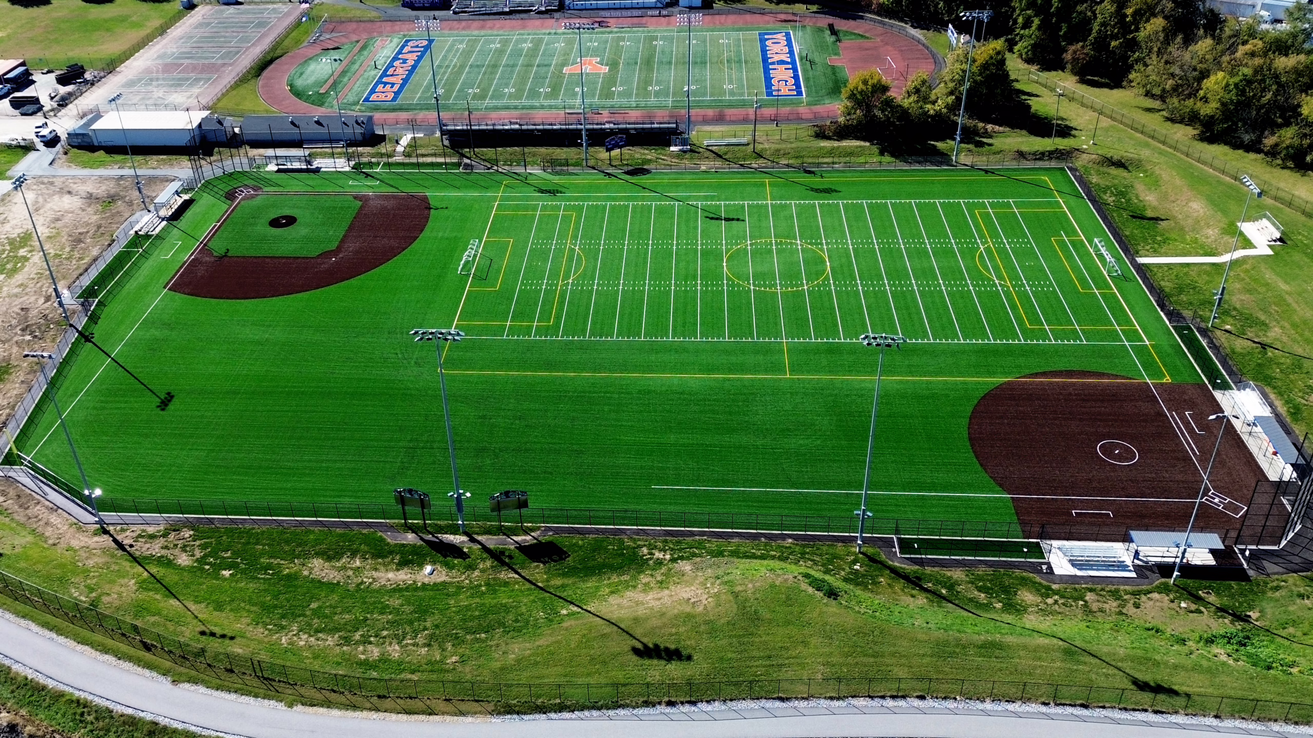 Keystone Sports Construction recently completed a design-build project for the York City School District’s multisport soccer, softball, and baseball field in York, PA. The school district boasts an extensive sports program that serves the city of York across 9 schools. This design-build project consisted of several phases, starting with the excavation of the existing grass field and the removal of pre-existing fixtures and structures. Next, a new stormwater drainage system was installed, and a newly constructed stone sub-base was laser graded. Following that, Keystone installed a new slit film synthetic turf system for the field. Additionally, new training events for discus and shot put were installed, along with paved walkways around the field.