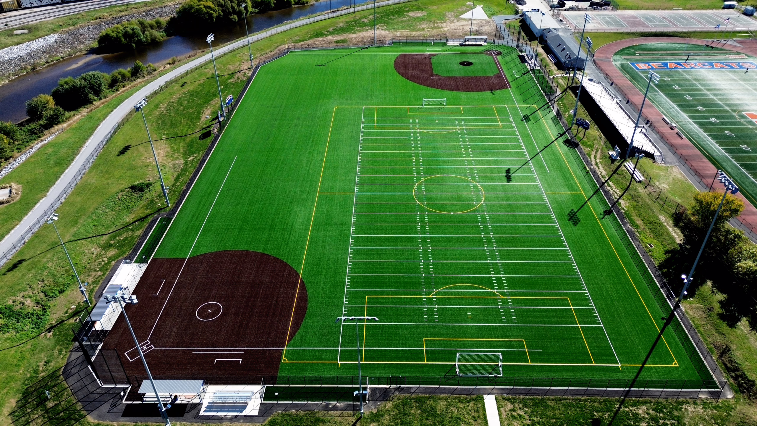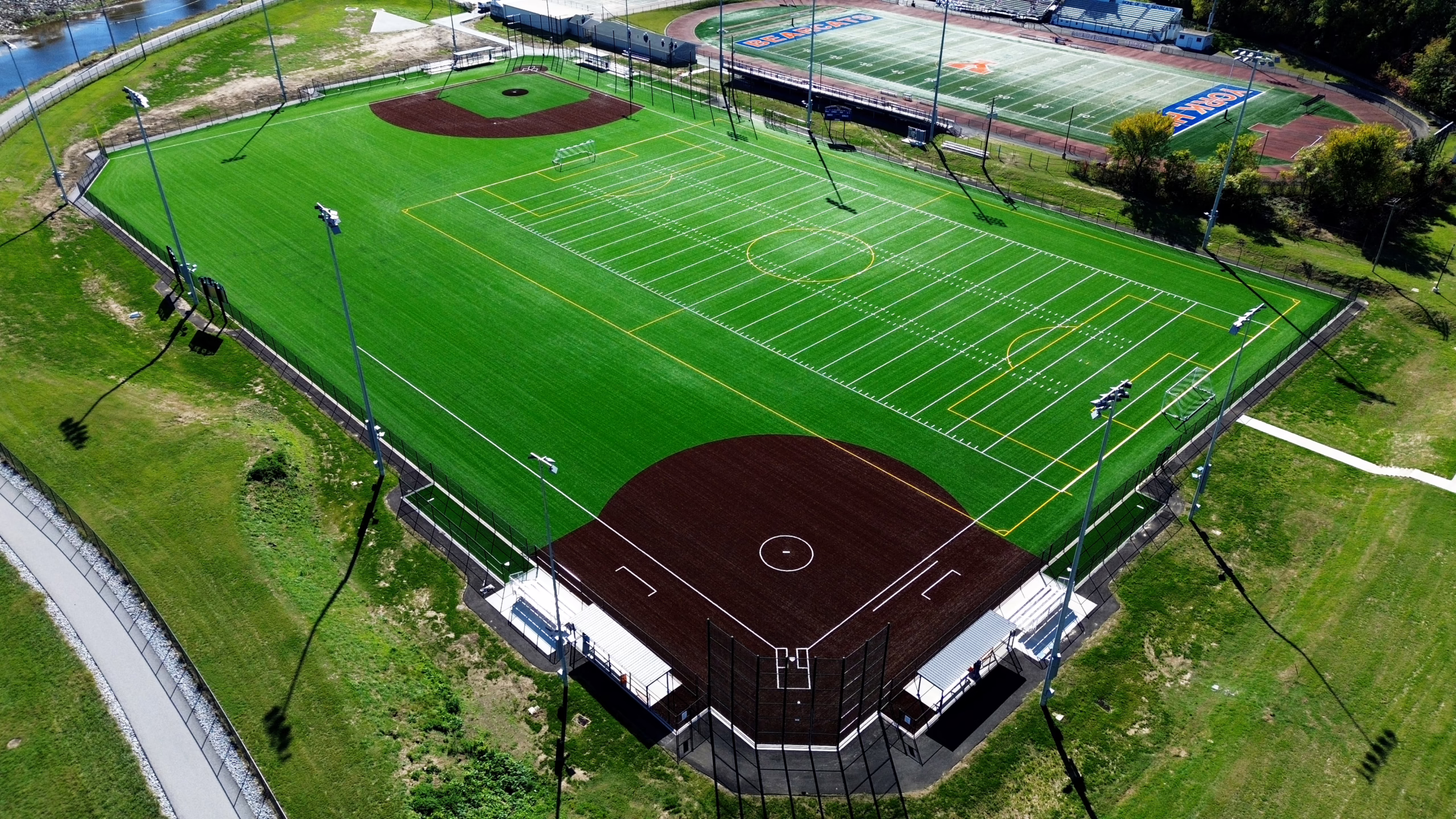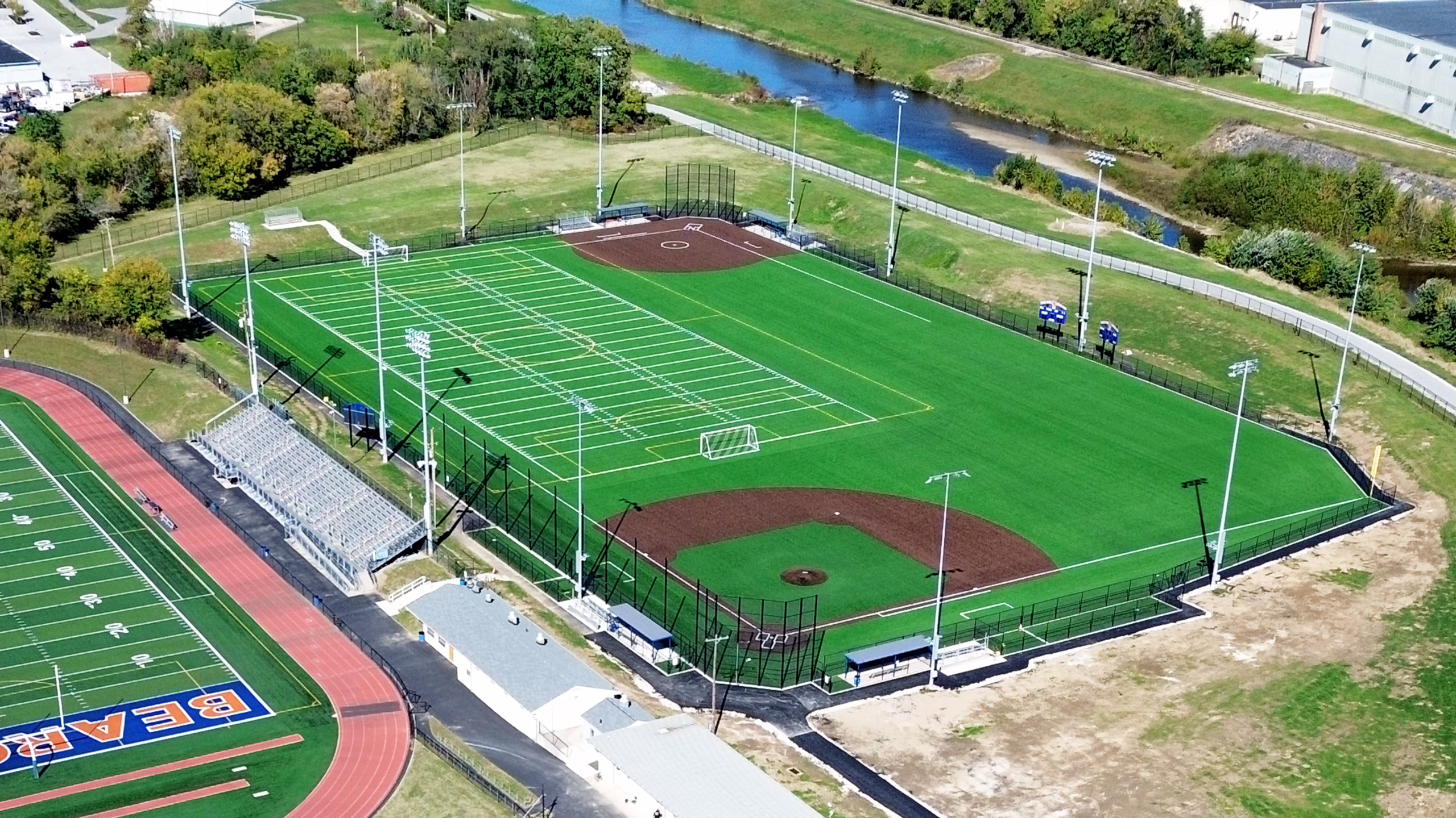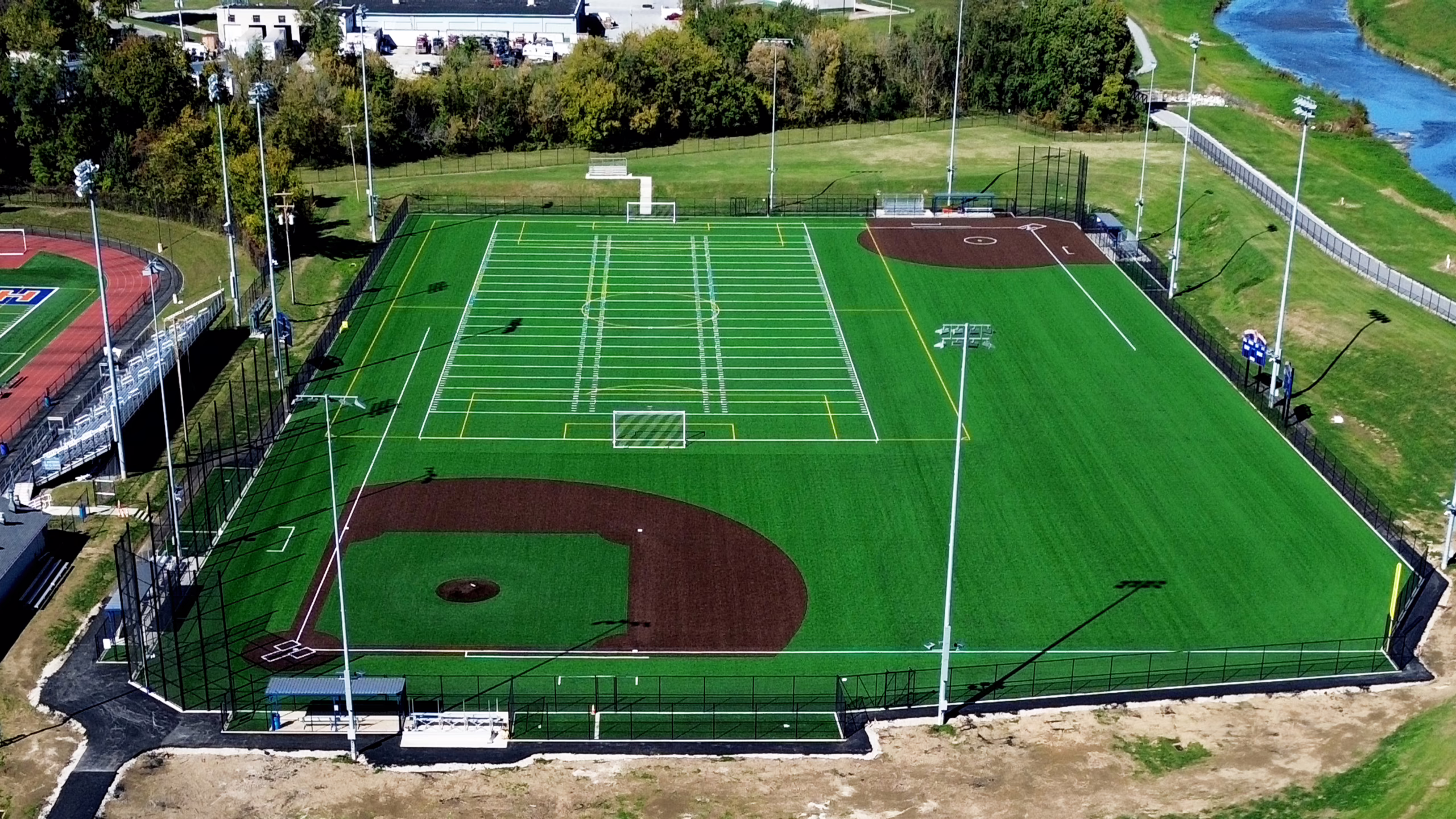 Design elements include field markings for baseball, softball, and soccer. Additionally, new chain-link fencing has been installed around the fields’ perimeter, along with backstopping and ball barrier netting and roll-out fencing for baseball and softball. Dugouts were installed for both the baseball and softball fields. Musco sports lighting was then installed along with three scoreboards.